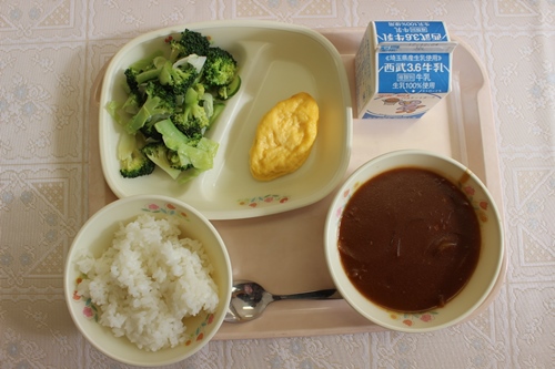 今日は、ハヤシライスでした。じゃがいもやにんじんなど具がたくさん入っていて、こくがありおいしかったです。人気の献立でみんな、もりもり食べていてごはんを残す子もほとんどいませんでした。オムレツは、甘めでふわふわしていておいしかったです。グリーンサラダは、ブロッコリーがたくさん入っていておいしかったです。