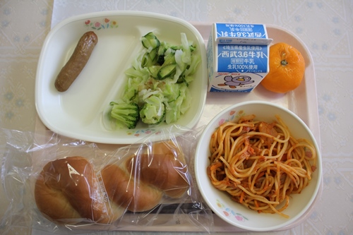今日は、ツイストパンでした。ふわふわでほんのり甘くておいしかったです。子どもたちも、おいしかったと言っていました。トンノスパゲッティーは、トマトとツナのソースのスパゲッティーのことです。ソースがよく絡まっていて、おいしかったです。みんなもりもり食べていました。冷凍みかんは、冷たくて甘くておいしかったです。