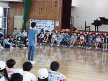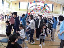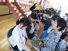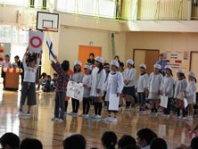1年生へ2年生からはメダル、3年生は会場の飾り付け、4年生は劇、5年生は似顔絵、6年生は一緒に入退場をプレゼントしました。お礼に1年生からは歌がプレゼントされました。