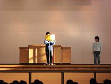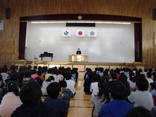 賞状の授与のあと、3年生の代表が2学期がんばったことと3学期の目標を発表しました。校長のお話は暗唱のこと、各学年で2学期がんばったことについて話がありました。