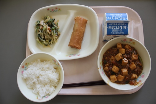 今日は、四川麻婆豆腐でした。少しピリ辛でしたが、味がよく染みていてごはんによく合っていておいしかったです。子どもたちももりもり食べていました。春巻きは、パリパリで中身がトロトロでおいしかったです。ネギのナムルは、ネギが苦手な子もおいしく食べられた様子でした。