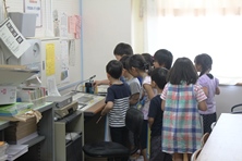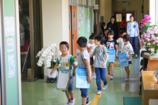 先日、1年生だけで学校を見て回りましたが、今回は2年生と仲良く学校内を見学しました。岡部小学校の先輩として2年生が引っ張り、1年生は静かにきちんと見学ができました。ある班の2年生は、ここがどんな教室か、1年生に説明をしてあげていました。