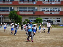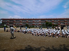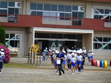 以前より時間がかかるかと思われましたが、ほとんど変わらない時間で外に集合でき、整列することができました。白いぴかぴかのヘルメットがきれいに並びました。