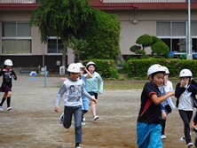 初めてのヘルメットをかぶった避難訓練でした。通学時でないときも有効に使えるよう災害時にもかぶるようにしました。