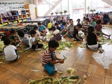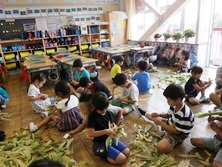 その次の時間にトウモロコシの皮を使って人形を作りました。材料は皮とつなげる輪ゴムだけ。やってみるとおもしろい人形がたくさんできました。