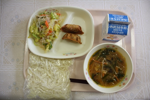 今日は、ごま味噌ラーメンでした。こくのあるスープで具だくさんでおいしかったです。子どもたちにも人気でスープまできれいに食べていました。揚げ餃子は、外はカリカリで中には具がたくさん詰まっていておいしかったです。中華サラダもさっぱりした味付けでおいしかったです。みんな、もりもり残さず食べていました。