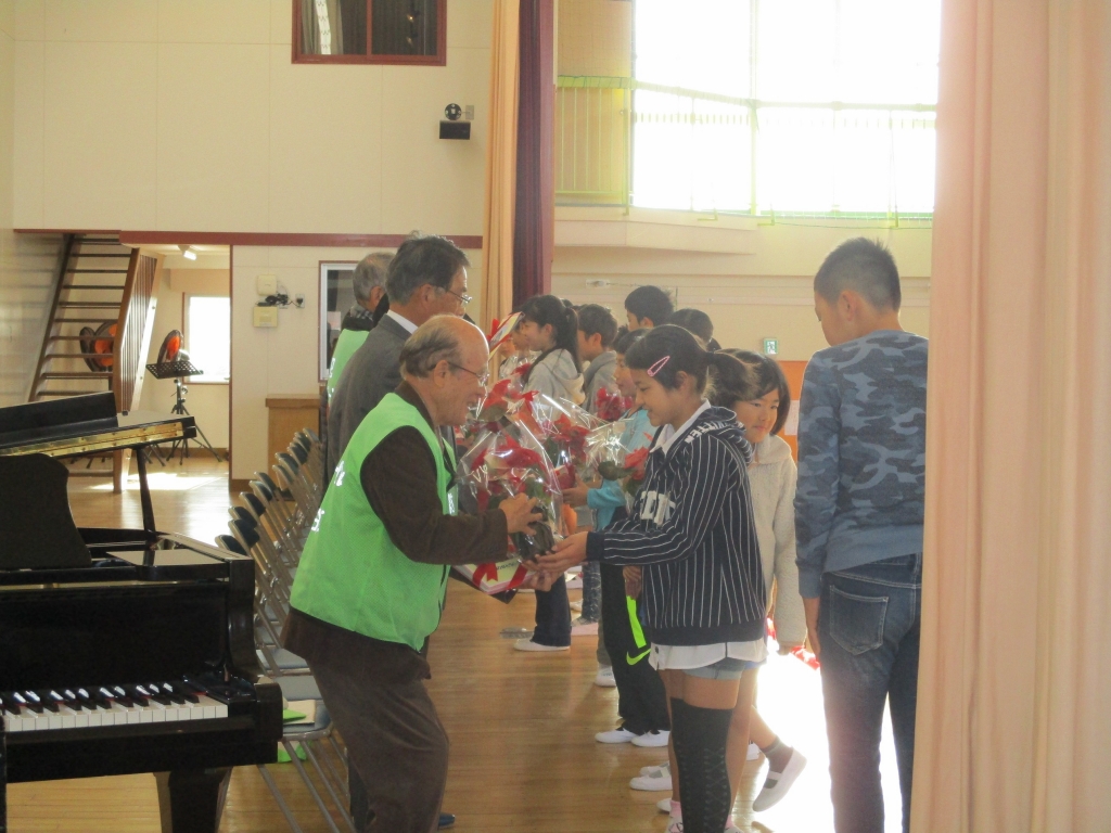11月15日(火)8時15分から、学校応援団でお世話になっている方や学校運営協議会委員の方16名に来校いただき、「ありがとう」集会」が行われました。子ども達の書いたお礼の手紙と鉢花を手渡し、感謝の気持ちを表しました。