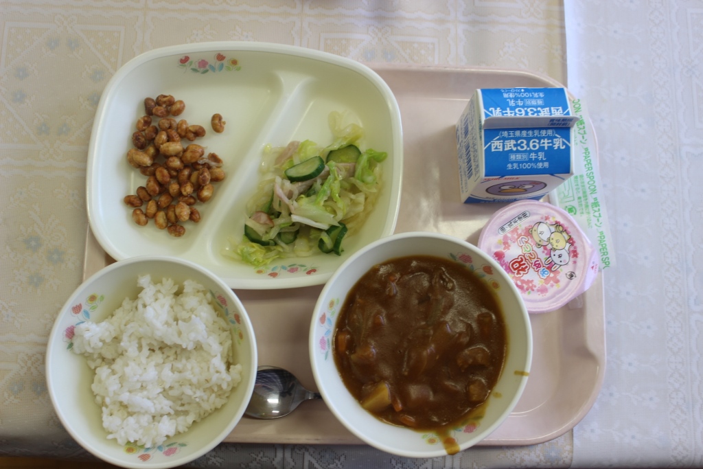 今日から1年生の給食が始まりました。待ちに待った給食の始まりで朝から楽しみな様子でした。先生のお話をしっかり聞いて上手に準備ができていました。6年生の皆さんもお手伝いしてくれていました。ポークカレーライスは、濃厚でおいしかったです。お祝いデザートは、かわいくておいしかったです。1年生の皆さんも楽しそうに食べていました。