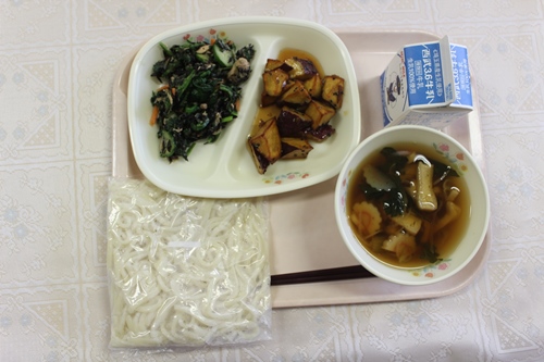 今日は、肉うどんでした。ねぎや油揚げ、肉などが入っていて、うまみがたっぷりでおいしかったです。うどんともよく合っていて、みんなおいしそうに食べていました。大学芋は、さつまいもが甘くて、たれもよく絡んでいて黒ごまがいいアクセントになっていておいしかったです。ほうれん草とひじきのサラダは、さっぱりした味付けでビタミンやミネラルがたっぷりのサラダでした。子どもたちに大人気のサラダで、どのクラスも完食でした。