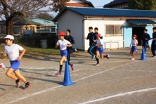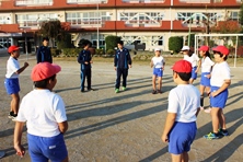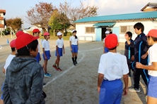 ①あごを引く②腕は軽く振る③呼吸をリズムよく行うなど高校で競技をしている生徒から直接指導してもらいました。実際に体を動かし体験することで児童の理解も高まります。