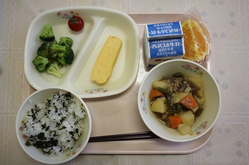 今日は、子どもたちに人気のわかめごはんでした。みんなもりもりたくさん食べていました。じゃがいものそぼろ煮は、じゃがいもがほくほくでそぼろと相性がよくて甘めの味付けでおいしかったです。子どもたちもおいしかったと言っていました。全体的に、赤、緑、黄色で彩りもきれいな給食でした。