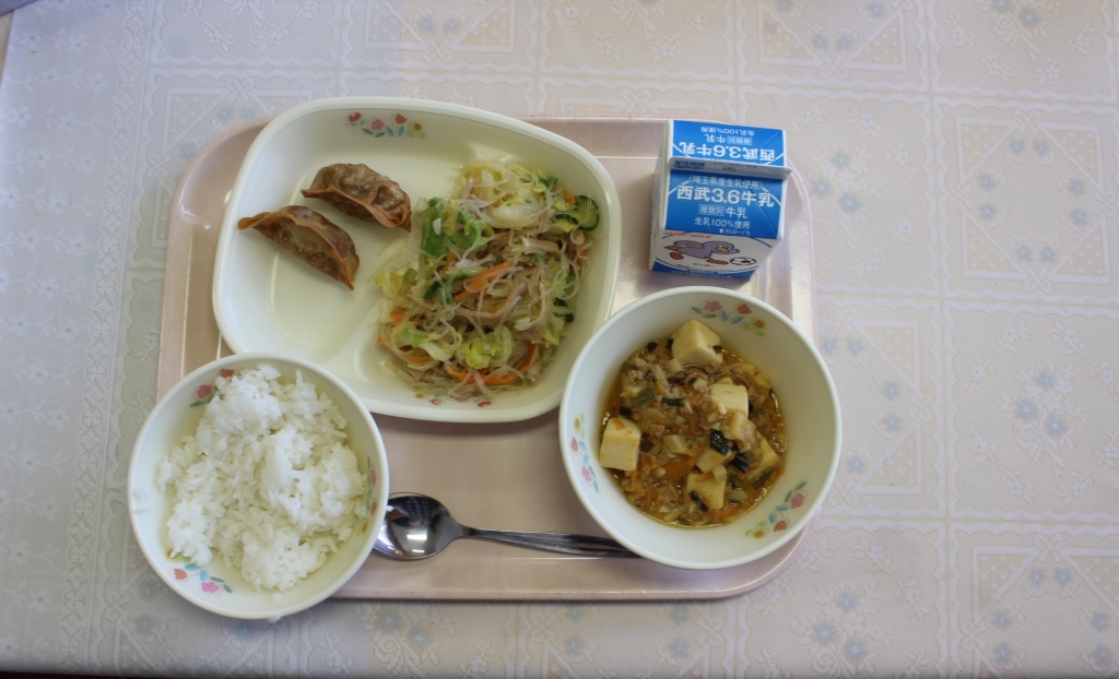 今日の給食は、麻婆豆腐、揚げギョウザ、中華サラダと中華づくしのメニューでした。麻婆豆腐は、辛すぎず丁度いい味付けでごはんとの相性もよかったです。揚げギョウザは、パリッとしていておいしかったです。中華サラダは、春雨、きゅうり、にんじん、キャベツ、ハムが入っていて春らしい彩りでおいしかったです。