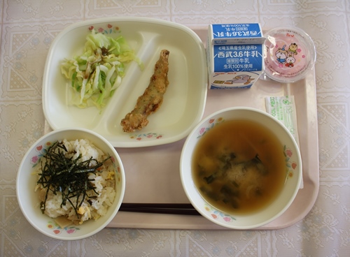 今日は、行事食としてちらし寿司と三色花ゼリーが出ました。3月3日の桃の節句にちなんだメニューです。ちらし寿司は、具だくさんでいろいろな食感が楽しめておいしかったです。彩りもきれいでした。子どもたちも、おいしそうに食べていました。ししゃもフリッターは、サクサクでおいしかったです。三色花ゼリーは、見た目もかわいくて甘くておいしかったです。