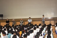 施設の様子を話してくれたり、このような交流を通じて福祉について考えてほしいなどのお話をいただきました。児童会長はお礼のことばで、点字ブロックといった身近なことに触れ進んで手助けできるようになりたいと話していました。