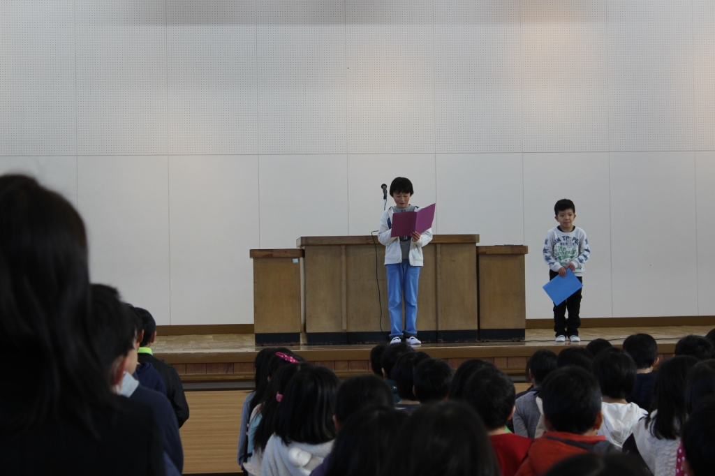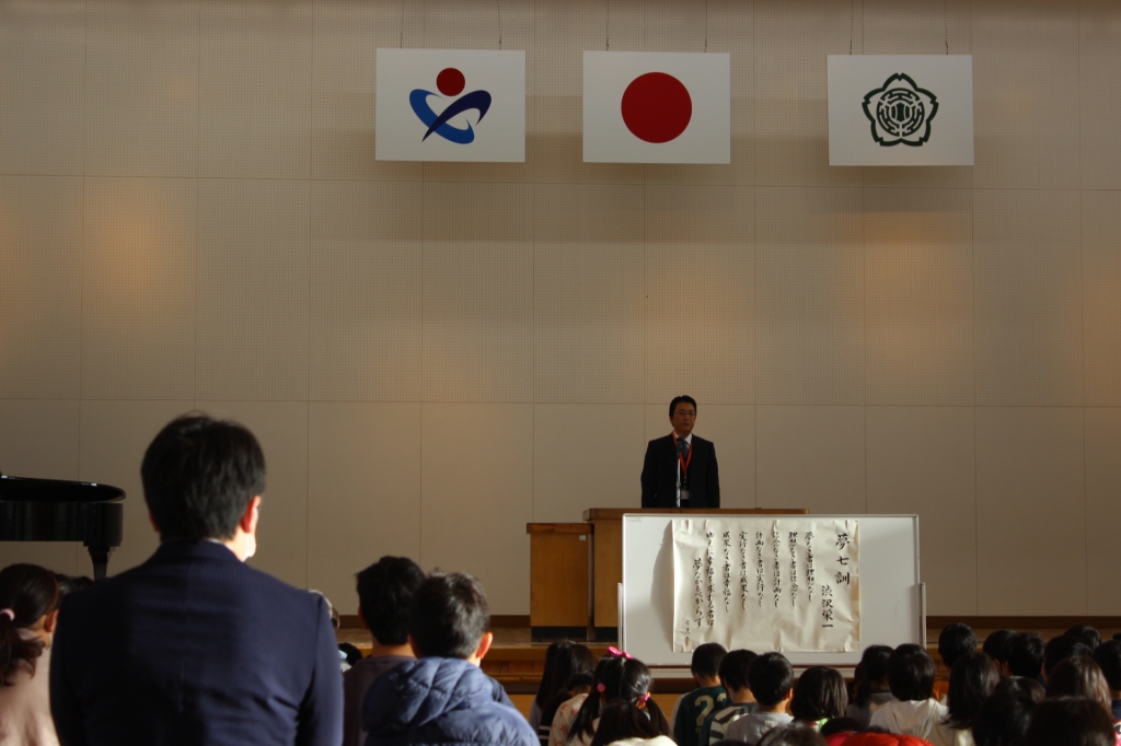 始業式の中で、校長先生より渋沢栄一翁の「夢七訓」についてのお話がありました。一行ずつ声に出して読み上げられた後、「しあわせのためには夢を持つこと」が大切であるという事だと分かりやすくお話をされました。校長先生が今年の目標を話された後には、2年生の代表2名が3学期のめあてを発表しました。