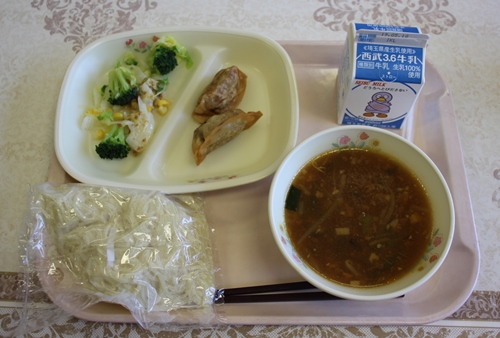 今日は、麻婆ラーメンでした。麻婆ラーメンは、とろみがあり麺に絡みやすく味もよく、おいしかったです。少し辛みがありましたが、みんなしっかり食べていました。「ラーメンがおいしかった」といっている子が多かったです。